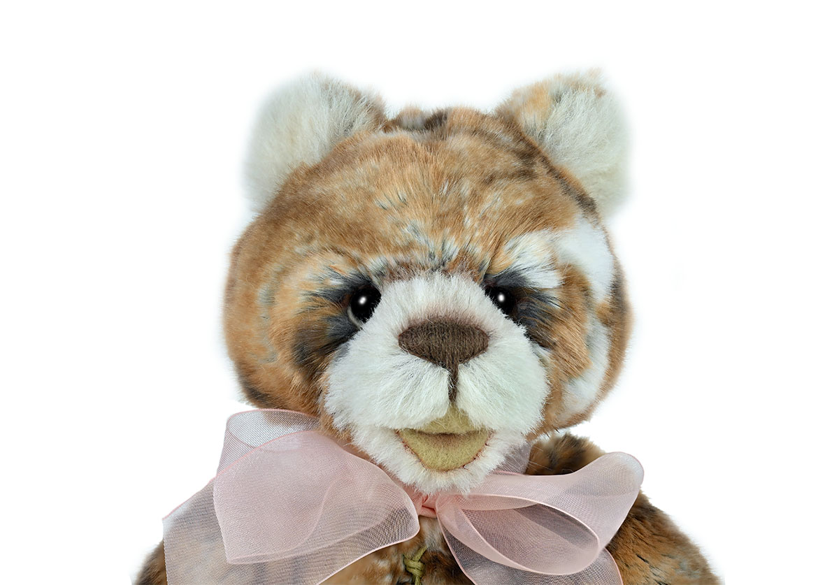 Das Material ist 94% Plüsch und 6 % Alpaka, charakteristisch ist das offene Maul, der Teddy ist 5-fach gegliedert.